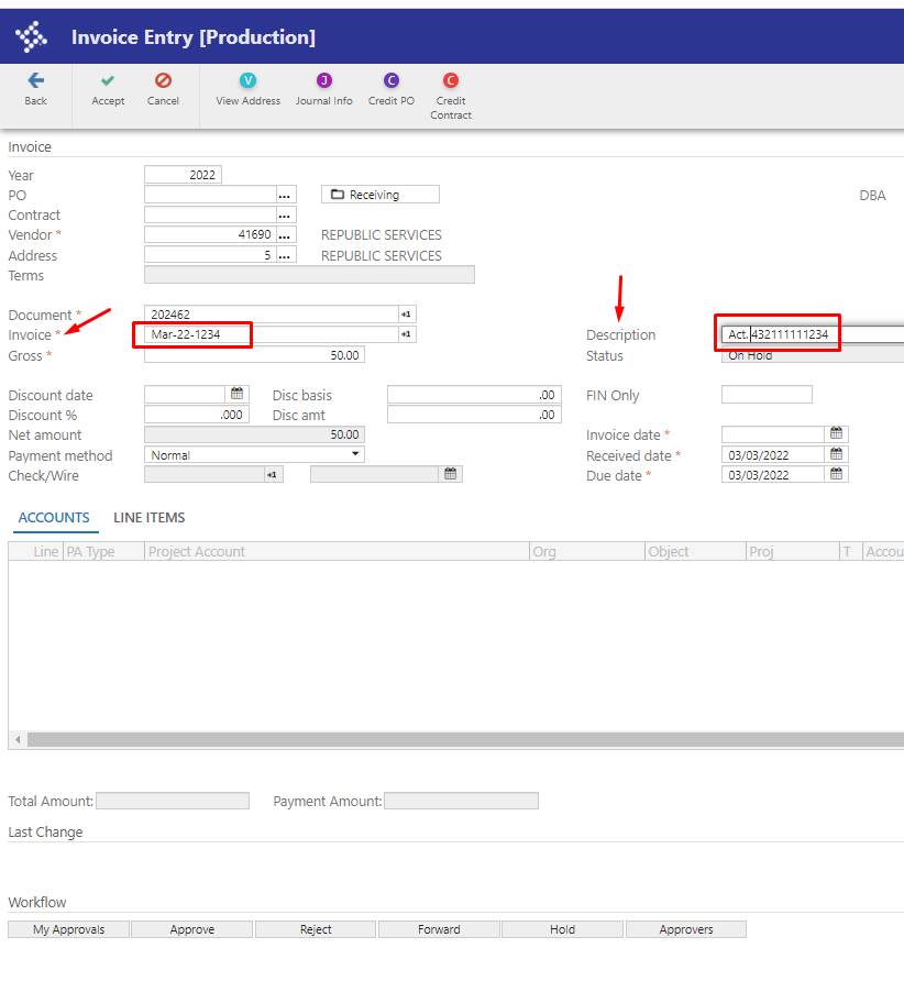 We think this scheme will work for utilities and reimbursements, but I know that there will be a few situations where these schemes will not work. I would recommend using your best judgement or reaching out to Finance for help when you encounter these. Invoice number and descriptions are used to help us find things at a later date. I would recommend using what you think people would be able to search to find this “thing” you are paying for 10 years from now.